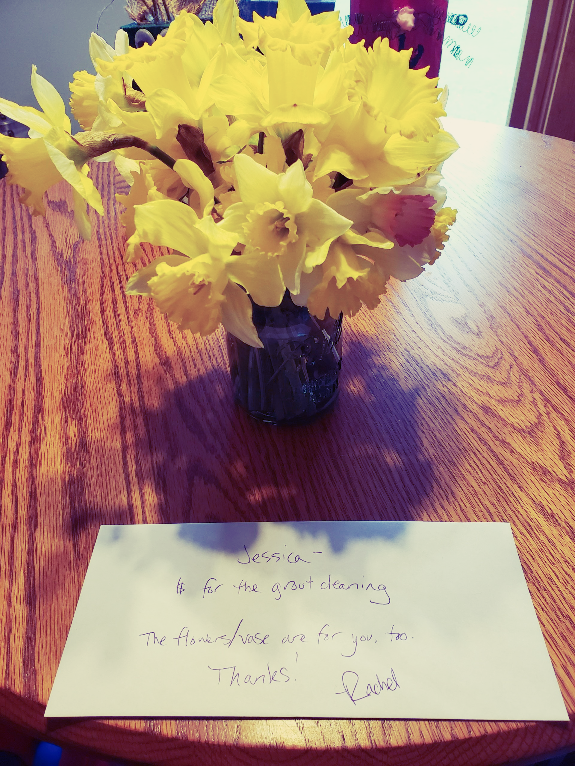 " $ for the great cleaning. The flowers/vase are for you too. Thanks!"